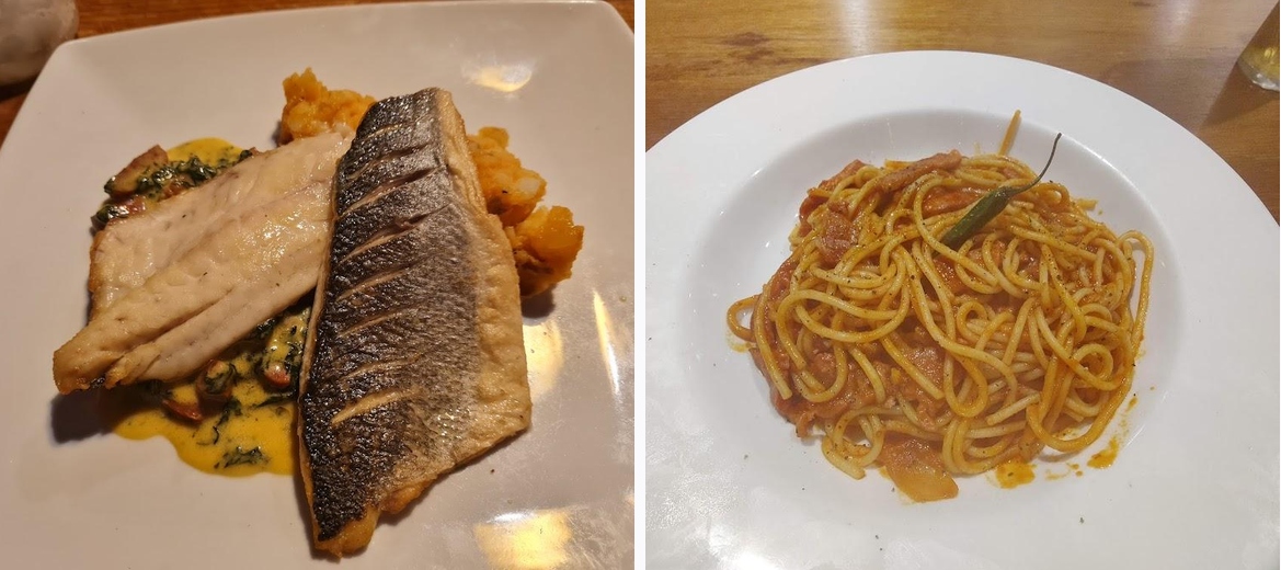 Excellent veggie lasagna and profiteroles.£30 inc wine Went back another day and had the seafood spaghetti, yummy.£20 inc tea. Friendly staff and good service